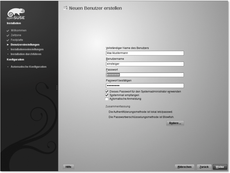 Abbildung 2.1 openSUSE-Installation: Anlegen eines Benutzers
