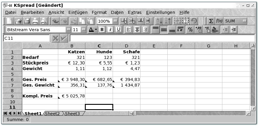 Abbildung 4.12 KSpread berechnet unsere Haustier-Bestellung.