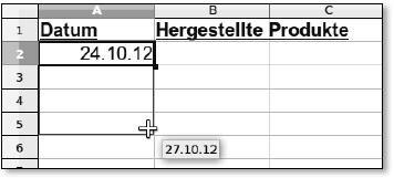 Um sich die Tipparbeit für die folgenden Datumseingaben zu ersparen, können Sie Calc anweisen, das Datum (jeweils um einen Tag fortgeschritten) automatisch für die weiteren Zellen einzutragen. Klicken Sie dazu mit der Maus auf die Zelle, in der Sie soeben das Datum eingetragen haben. In der unteren rechten Ecke der Zelle erscheint nun ein schwarzer Ankerpunkt. Klicken Sie mit der linken Maustaste darauf und halten Sie die Maustaste gedrückt. Ziehen Sie die Maus nun so viele Spalten nach unten, wie Sie möchten (wie in Abbildung zu sehen), um die Datumswerte vervollständigen zu lassen. Lassen Sie anschließend einfach die Maustaste los. Diese Autovervollständigung von Zellenwerten funktioniert übrigens auch mit Zahlen.