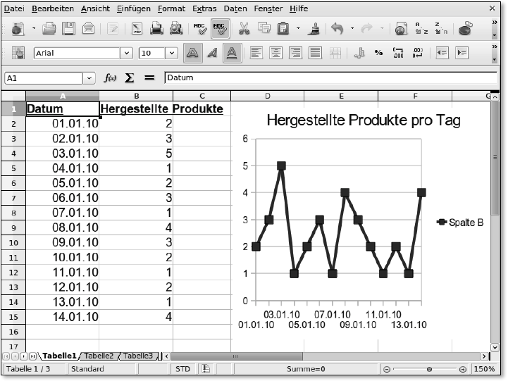 Calc ist ein sehr umfangreiches Werkzeug und kann in diesem Buch nicht so einfach beschrieben werden wie Writer, dessen Bedienung deutlich einfacher ist. Einige erste Tipps möchten wir Ihnen dennoch mit auf den Weg geben. Unser Ziel soll es sein, das in Abbildung zu sehende Dokument zu erstellen: Es enthält eine Tabelle, die einem Datum eine Anzahl hergestellter Produkte zuordnet, und stellt die daraus ersichtliche tägliche Produktion in einem übersichtlichen Diagramm dar.