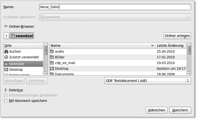 Wenn Sie eine Datei speichern oder öffnen wollen, müssen Sie angeben, wo diese Datei gespeichert werden soll bzw. welche Datei geladen werden soll. Sollten Sie sich nicht mit dem Linux-Dateisystem auskennen (das wird sich ändern, nachdem Sie dieses Buch gelesen haben!), dann speichern Sie Dateien am besten einfach in Ihrem Heimatverzeichnis (dieses ist im Normalfall schon ausgewählt). Zum Laden doppelklicken Sie auf einen Dateinamen; zum Speichern geben Sie einen neuen Dateinamen (wie in der Abbildung zu sehen) ein und drücken Sie auf Speichern.