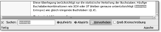 Im Textfeld können Sie einen Suchausdruck eingeben, und noch währenddessen durchsucht Firefox die Seite danach und zeigt Ihnen den ersten Treffer an. Mit der Hervorheben-Funktion können Sie alle Fundstellen einer Seite markieren lassen. Drücken Sie die Enter-Taste, um zum nächsten Suchergebnis zu gelangen, oder nutzen Sie dazu die Schaltflächen Aufwärts und Abwärts.