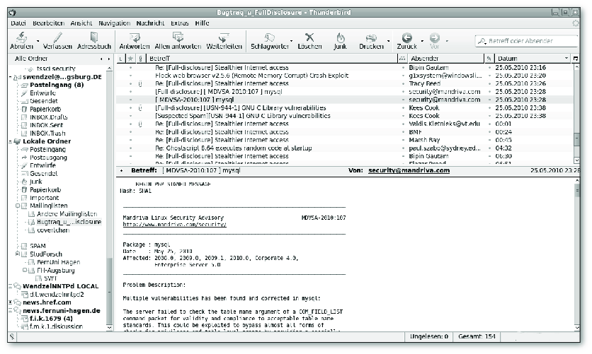 Viel schneller ist es, Mails mit einem Mailprogramm abzuholen. Windows-Benutzer werden hierbei in erster Linie an Outlook Express, Outlook und Thunderbird denken. Unter Linux stehen gleiche bzw. ähnlich gute Programme (etwa Evolution als Outlook-Ersatz) zur Verfügung. Wir werden uns im Folgenden auf das Mailprogramm Thunderbird konzentrieren, da es fast immer verfügbar ist und es viele Windows-Umsteiger bereits kennen. Weitere typische Linux-Mailprogramme (speziell für die Konsole und für das automatische Abholen von Mails) lernen Sie in Kapitel kennen.