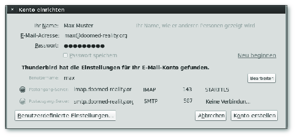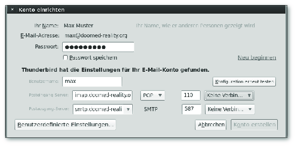 Sollten keine Server gefunden werden oder sollten die gefundenen Server nicht mit den Informationen Ihres Providers übereinstimmen, klicken Sie auf Benutzerdefinierte Einstellungen. Daraufhin schließt sich das Dialogfeld und Sie finden in der Menüleiste des vorherigen Dialogs Konten-Einstellungen einen Menüeintrag für Ihr neues Konto.