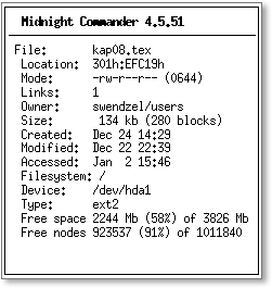 - Long file list zeigt die gleiche Ausgabe wie ls -l, verwendet dazu aber den kompletten Darstellungsbereich des Midnight Commanders.