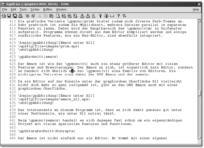 Verglichen mit dem Standard-vi läuft der vim auf noch mehr Systemen und Plattformen. Zudem kommt eine auf GTK+ basierende grafische Oberfläche hinzu, und farbiges Syntax-Highlighting für diverse Programmiersprachen ist implementiert. Der vim ist vollständig vi-kompatibel und unterstützt jedes seiner Features. Mehr über diesen Editor erfahren Sie unter http://www.vim.org.