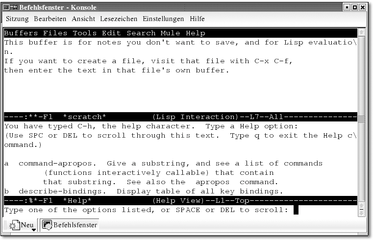 In diesen Fenstern sehen Sie zwei Puffer, die beide mit keiner Datei assoziiert sind. Im obersten Fenster ist der Standardpuffer *scratch zu sehen. Im unteren Fenster haben wir uns mit C-h ? eine Übersicht über alle Hilfethemen anzeigen lassen.