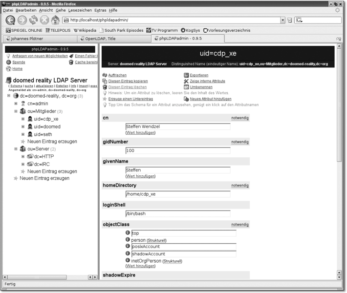 Im obigen Beispiel kann man sehr gut sehen, dass für einen Eintrag der eindeutige Name (dn) gleichzeitig seinen Platz im Netz festlegt: Auf dem Server dc=doomed-reality,dc=org ist der Benutzer uid=cdp_xe unterhalb des Knotens ou=Mitglieder platziert. Des Weiteren ist ebenfalls zu erkennen, dass der Eintrag mehreren Objektklassen angehört, deren Attribute allesamt mit sinnvollen Werten [Fn. Im Falle eines Benutzereintrags kennen Sie diese Felder natürlich bereits aus den Dateien /etc/passwd und /etc/shadow. Dabei wird auch bei LDAP das Passwort nicht im Klartext, sondern verschlüsselt abgespeichert.] belegt sind.
