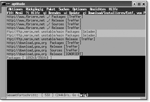 Pakete werden dann schließlich entweder im Internet oder auch auf CD zu sogenannten Repositories – also zu Verzeichnissen [Fn. Repositories sind Verzeichnisse mit Paketen samt diverser Metadaten.] – zusammengefasst, auf die dann Programme wie APT (Advanced Packaging Tool) zugreifen können, um die Pakete zu laden.