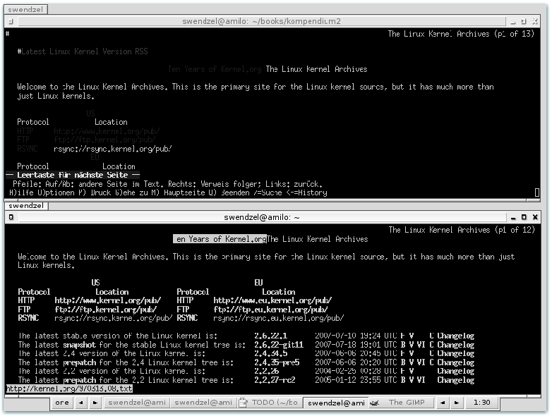 Als echter Linux-User sollten Sie natürlich in der Lage sein, auch einmal ohne die grafische Oberfläche im Internet zu »surfen«. Zu diesem Zweck gibt es sehr ausgefeilte Konsolenbrowser wie lynx und links. Die Browser kann man dabei bequem über die Kommandozeile direkt mit der aufzurufenden URL starten: