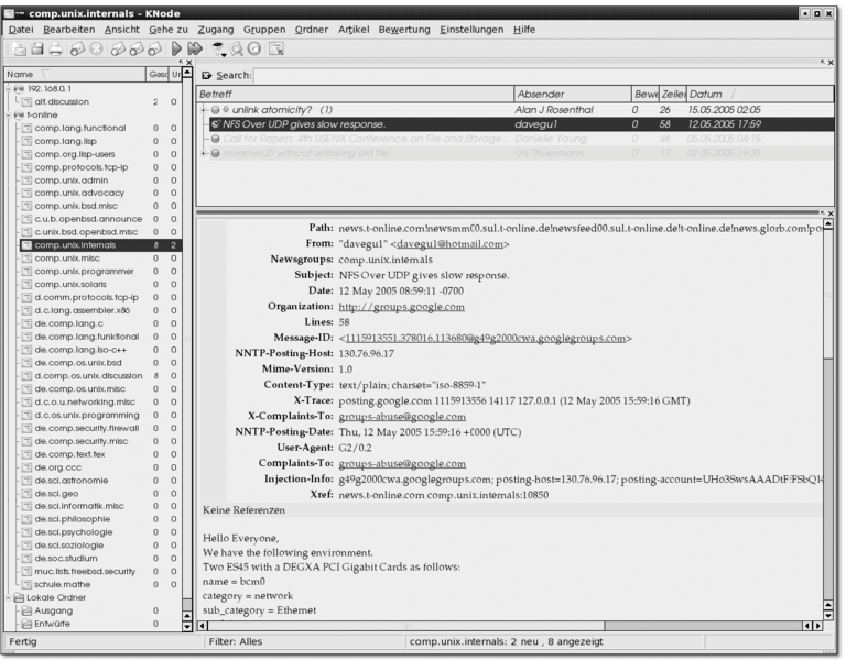 Als vorletzten, ebenfalls sehr empfehlenswerten Client dieser Runde möchten wir Ihnen KNode (siehe Abbildung knode) vorstellen.