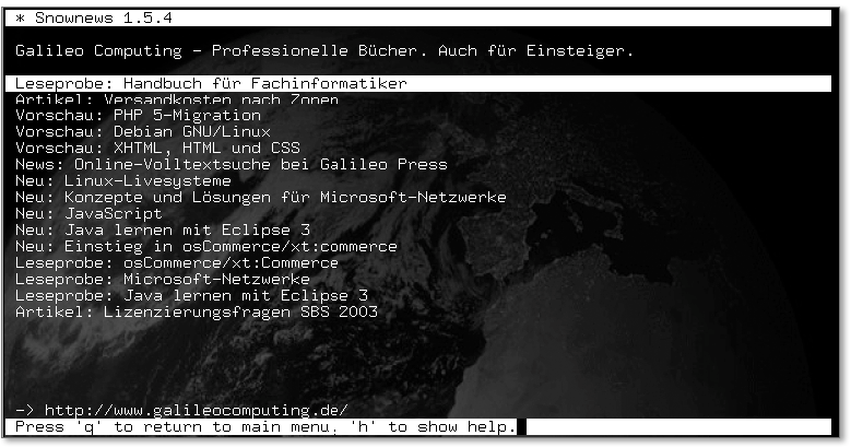 Daraufhin erscheint eine Zeile mit dem Titel »Galileo Computing«. Drückt man nun Return, wird einem die Liste der aktuellen Nachrichten des Verlags angezeigt. Zurück in das vorherige Menü kommen Sie durch Drücken der Taste Q, wodurch Sie im Hauptmenü auch das Programm beenden können. Die interne Hilfe wird mit H aufgerufen.