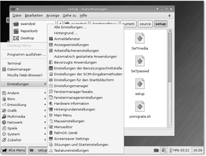 Das dritte Desktop-System, das wir Ihnen nun vorstellen werden, ist XFCE. Es verfügt, ähnlich wie GNOME, über ein Panel und eine Taskbar; zudem gibt es, wie bei jedem Window-Manager und Desktop, virtuelle Desktops. Das Desktop-System ist so konfigurierbar, wie man es von der Systemsteuerung unter Windows gewohnt ist: Es gibt für alle möglichen Konfigurationsbereiche ein Icon, das auf einen Doppelklick hin ein Menü öffnet. Unterstützt werden neben Standard-Themes auch Icon-Themes und Plugins, die sich in Form von Miniprogrammen in das Panel integrieren lassen und zum Beispiel die Wettervorhersage der Region anzeigen können.