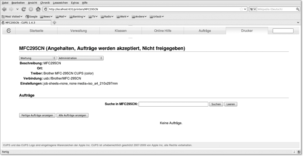 CUPS selbst bietet ein Webinterface, über das es sich konfigurieren lässt. Standardmäßig werden Sie auf Port 631 des lokalen Rechners eine Administrationsoberfläche unter folgender URL vorfinden: