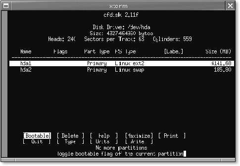 Ist Ihnen fdisk zu kryptisch? Kein Problem: Das Programm cfdisk bietet eine konsolenbasierte grafische Oberfläche und kann mit den Cursor-Tasten bedient werden, wobei die Tasten Nach oben und Nach unten zur Auswahl der Partition und die Tasten Nach links und Nach rechts zur Auswahl der Menüoption dienen.