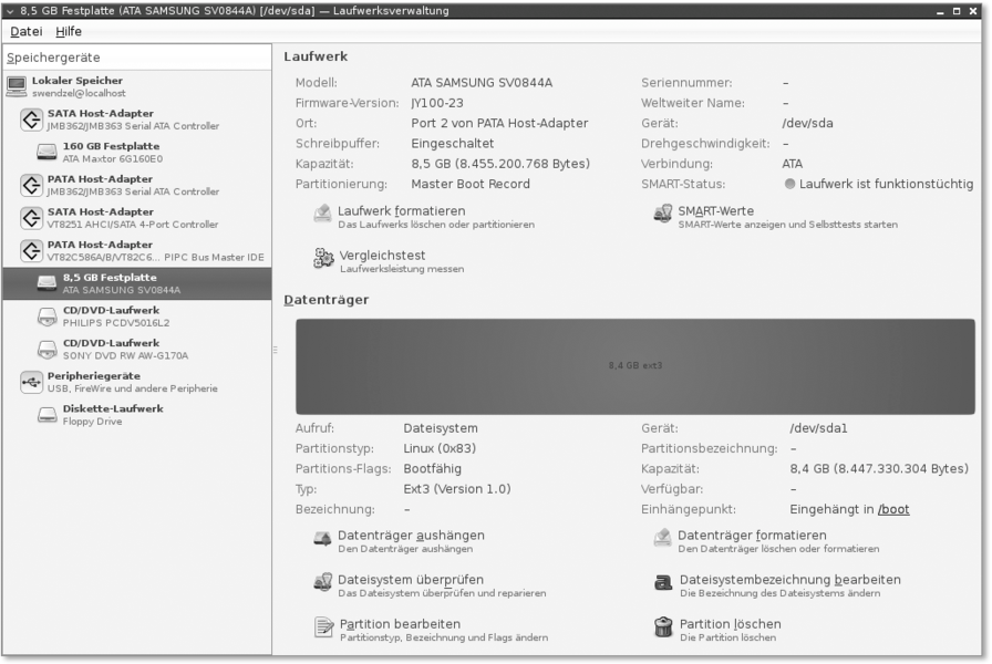 Mit palimpsest gibt es ein sehr umfangreiches Programm zur Administration und Überwachung von Laufwerken. palimpsest kann nicht nur Partitionierungen vornehmen, Datenträger formatieren und Dateisysteme überprüfen, sondern auch SMART-Werte auslesen und darstellen. Sie können dem Programm beim Starten die gewünschte Platte als Parameter übergeben (palimpsest --show-drive=/dev/sda), aber das ist nicht notwendig, da Sie sie auch in der Oberfläche selektieren können.