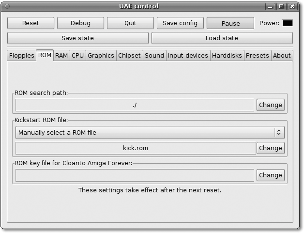 UAE emuliert die Hardware eines Amiga 500, wofür allerdings ein originales Kickstart-ROM eines solchen Amigas benötigt wird. Zwar sind diese ROMs auch auf nicht legalen Wegen im Internet zu finden, aber eigentlich sollte man den Kickstart von seinem eigenen Amiga laden und auf den Linux-Rechner übertragen. [Fn. Für den Fall, dass Sie einmal einen solchen Amiga besessen haben und eine dieser relativ eckigen Mäuse verwendeten: Der Komfortgewinn, den Sie durch die Nutzung Ihrer normalen PC-Maus am Rechner erzielen, ist enorm.]