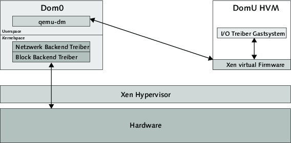 Um genau das zu erreichen, wird die Xen virtual Firmware in den Speicher des DomU-HVM-Gastes geladen. Die virtuelle Firmware verhält sich gegenüber dem Gastsystem so, wie es ein normales BIOS tun würde – jedoch kommuniziert die Firmware mit einem korrespondierenden Dienst (qemu-dm) in der Dom0. Dieser unterstützt die virtuelle Maschine bei allen I/O-Anfragen wie beispielsweise Zugriffen auf Netzwerk oder Festplatte.