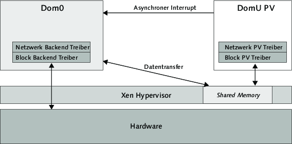 Möchte der paravirtualisierte Gast auf Netzwerk- oder Festplattenblöcke zugreifen, kann er über seine PV-Treiber in den gemeinsam genutzten Speicher schreiben und die Dom0 schließlich über einen Interrupt anweisen, die Anfrage auszuführen und beispielsweise den hinterlegten Datenblock auf die Festplatte zu schreiben.