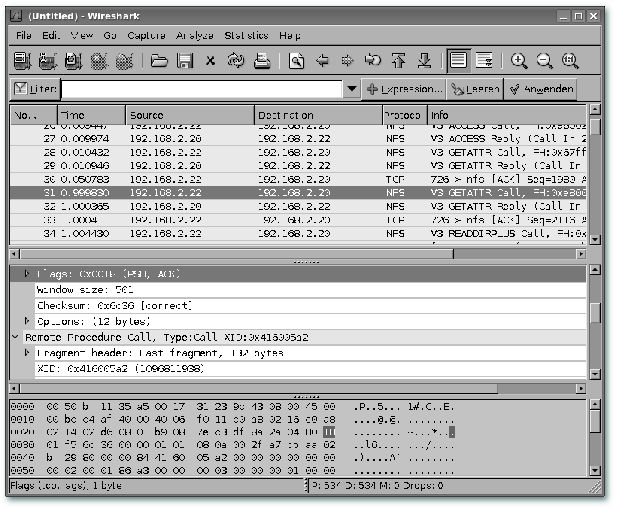 Eine Abstraktionsschicht darüber ist das Programm Wireshark, das uns zwar auch alle Informationen über die gesendeten Pakete gibt, aber den kryptischen Inhalt bereits hervorragend aufschlüsselt und erklärt.