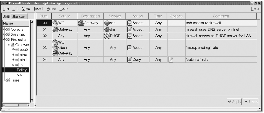Sie fragen, wie das Ganze mit iptables zusammenhängt? Nun, fwbuilder erstellt aus Ihren Regeln ein ganzes Skript voller iptables-Befehle. Alternativ könnten aus denselben Regeln beispielsweise auch pf-Regeln für OpenBSD erzeugt werden.