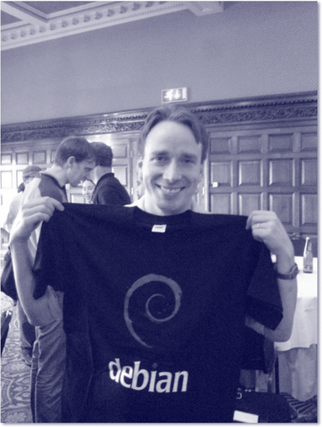 Abbildung 1.2 Linus Torvalds, der »Erfinder« von Linux, mit einem Shirt, auf dem das Logo von Debian zu sehen ist (Quelle: http://pdg86.wordpress.com/2009/12/03/linus-with-a-debian-t/)
