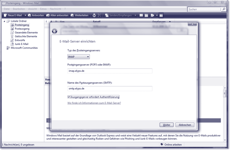 Da wir die zahlreichen Probleme, die beim Ex- und Import auftreten können, vermeiden wollen, beschäftigen wir uns nun zuerst mit einer vorbildlichen Speicherung von E-Mails. Das Zauberwort hierbei lautet IMAP. IMAP wurde mit dem Ziel entworfen, den Zugriff auf Mailboxen und Nachrichten so bereitzustellen, als ob diese sich auf dem lokalen Rechner befänden. Ob Sie IMAP mit Ihrem bisherigen Postfach nutzen können, erfahren Sie von dem Anbieter Ihres Postfachs.