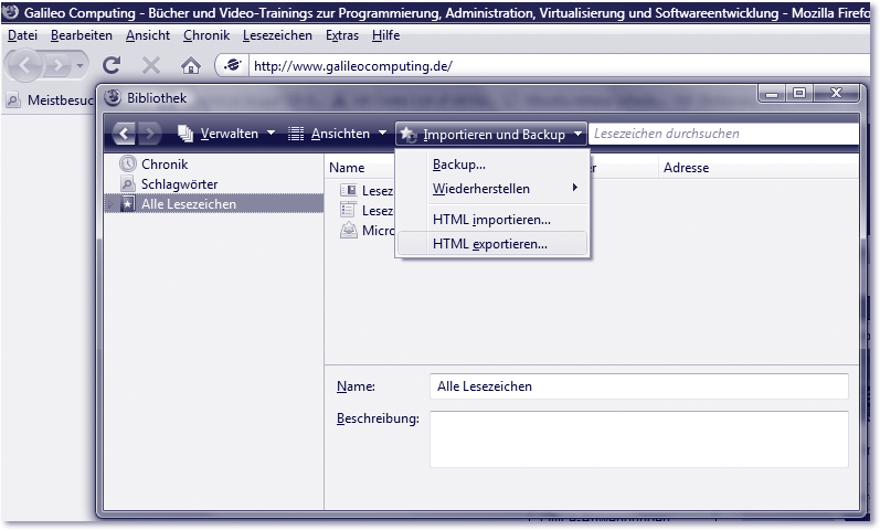 Im Firefox (dies gilt sowohl für die Windows- als auch für die Linux-Version) starten Sie zunächst die Bibliothek über Lesezeichen • Alle Lesezeichen anzeigen. Dann wählen Sie in der Windows-Version Importieren und Backup (siehe Abbildung 4.18). Um beispielsweise den Import-Dialog zu nutzen, wählen Sie hier Wiederherstellen und geben dann den Pfad zu der HTML-Datei mit Ihren Lesezeichen an. Firefox speichert bei einer Veränderung automatisch Ihre Lesezeichen und versieht diese mit einem Datum. Sie können auf diese Weise schnell und bequem einen vorherigen Stand wiederherstellen. Wenn Sie die Lesezeichen manuell wiederherstellen möchten, klicken Sie hier Datei wählen.... In der Linux-Version finden Sie den gleichen Dialog über Importieren und Sichern. Möchten Sie unter Windows den Firefox neu installieren, werden Sie beim ersten Start des Firefox automatisch gefragt, ob Sie Ihre Favoriten aus dem Internet Explorer importieren lassen möchten. Selbstverständlich können Sie den Import von Lesezeichen auch später nachholen. Dazu folgen Sie einfach dem oben beschriebenen Weg.