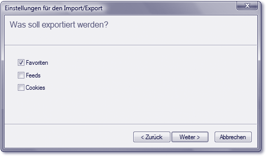 Um in den Internet Explorer Lesezeichen/Favoriten (aber auch Feeds und Cookies) zu importieren oder zu exportieren, klicken Sie auf Favoriten • Zu Favoriten hinzufügen • Importieren und Exportieren... (siehe Abbildung 4.15). Im sich öffnenden Assistenten (siehe Abbildung 4.16) können Sie in einem ersten Schritt auswählen, ob Sie die Browsereinstellungen automatisch aus einem anderen Browser importieren möchten oder für den Im- und Export lieber eine Datei verwenden möchten. In einem zweiten Schritt (siehe Abbildung 4.17) legen Sie erst fest, was Sie genau im- oder exportieren möchten.