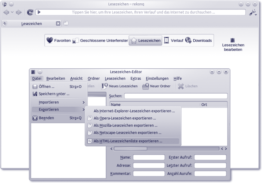 Beim Import unterstützt der rekonq sogar noch mehr Formate, und Lesezeichen aus älteren KDE-Versionen lassen sich auch importieren. Der Unterpunkt HTML-Lesezeichen importieren steht nicht zur Verfügung; wenn Sie als Format Mozilla-Lesezeichen auswählen, wird aber ein HTML-Format erwartet.