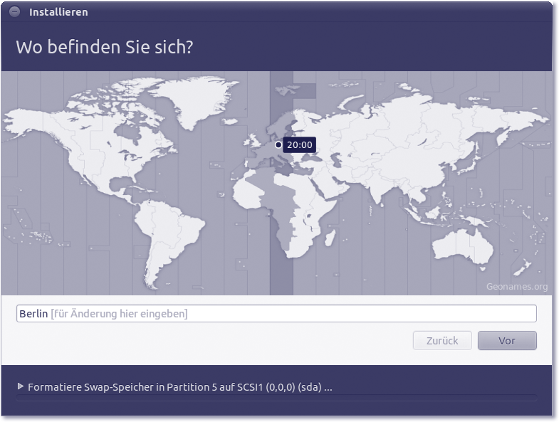 Jetzt wählen Sie Ihren Standort und die zugehörige Zeitzone (siehe Abbildung 5.18). Dies erledigen Sie einfach durch einen Klick auf die in Zeitzonen eingeteilte Weltkarte. Es ist hierbei egal, in welchem Teil Deutschlands Sie sich befinden, da es für die Bundesrepublik (oder auch Österreich und Schweiz) nur eine einzige Zeitzone gibt. In einem Land wie Russland ist der genaue Standort allerdings wichtiger, da es dort neun Zeitzonen gibt.