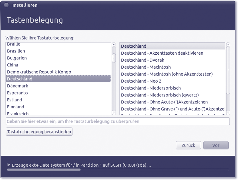 Mit dem folgenden Schritt beenden Sie die Lokalisierung Ihres zukünftigen Systems. Es folgt die Wahl des richtigen Tastaturlayouts. Normalerweise brauchen Sie aber gar keine Auswahl zu treffen und können einfach auf Vor klicken.