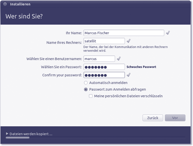 Bei der Angabe Ihrer persönlichen Daten haben Sie die Möglichkeit der Verschlüsselung. Hierbei wird Ihr persönlicher Ordner, in welchem alle Ihre benutzerspezifischen Daten abgelegt werden, verschlüsselt – nicht das gesamte System. Eine derartige Verschlüsselung ist gerade bei mobilen Rechnern – also Note- und Netbooks – durchaus sinnvoll, da hier die Gefahr des Diebstahls wesentlich größer ist. Eine kleine Warnung darf aber nicht fehlen: Vergessen Sie auf keinen Fall Ihr persönliches Kennwort, da Sie ansonsten keinen Zugriff mehr auf Ihre Dateien haben!