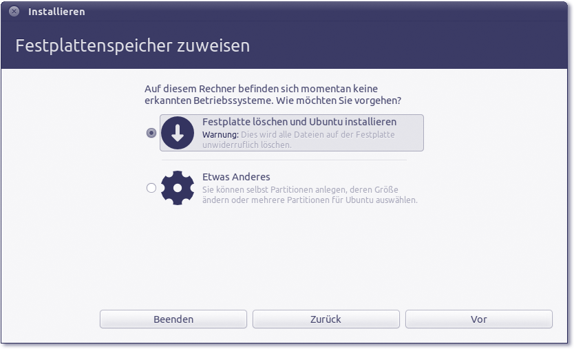 Hierbei installieren Sie Ubuntu, wobei ein eventuell nicht erkanntes System und alle Daten dabei gelöscht werden. Diesen Punkt wählen Sie, wenn Sie auf Ihrem Rechner lediglich Ubuntu verwenden möchten und nicht noch parallel ein anderes Betriebssystem (beispielsweise Windows) installiert haben.Abbildung 5.15 Bei einer leeren Festplatte sind die Möglichkeiten naturgemäß beschränkt.