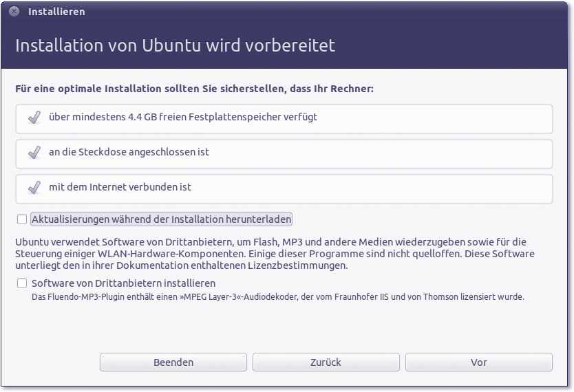Ein grüner Haken und ein schwarzes Kreuz signalisieren den Status der Voraussetzungen (vgl. Abbildung 5.11). Idealerweise wird der Zugang zum Internet durch einen Router realisiert, der systemunabhängig zu konfigurieren ist, beispielsweise per Browser. Ein moderner Router kann in Verbindung mit einem bestehenden DSL- oder ISDN-Anschluss genutzt werden und besitzt oftmals auch ein integriertes Modem. Ubuntu kann dann in Verbindung mit solchen Geräten bereits während des Installationsvorgangs für den (Internet- beziehungsweise Netzwerkeinsatz eingerichtet werden.