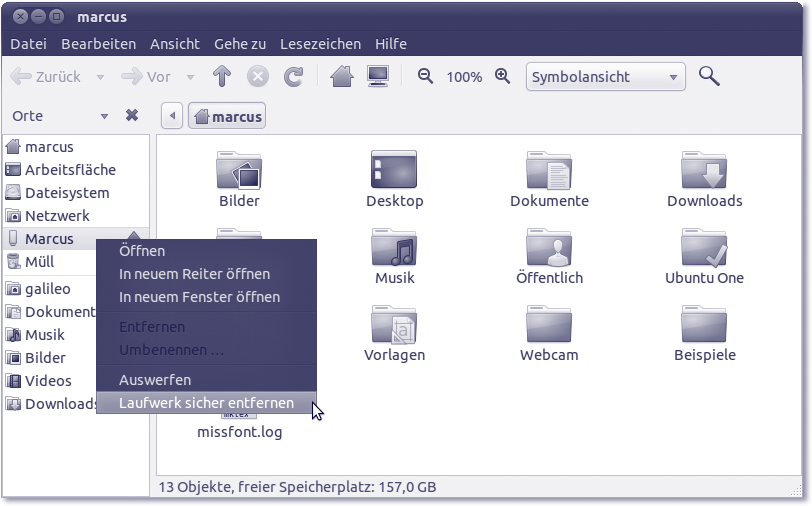 Bevor Sie Ihren USB-Stick wieder entfernen können, müssen Sie ihn aus dem System aushängen. Dies geschieht auf die gleiche Weise wie beim Einhängen (siehe Abbildung 5.10), nur dass Sie nun beim Rechtsklicken den Punkt Laufwerk sicher entfernen auswählen. Ein ordnungsgemäßes Aushängen des Sticks ist unbedingt erforderlich, da Sie sonst den Verlust Ihrer Daten riskieren!