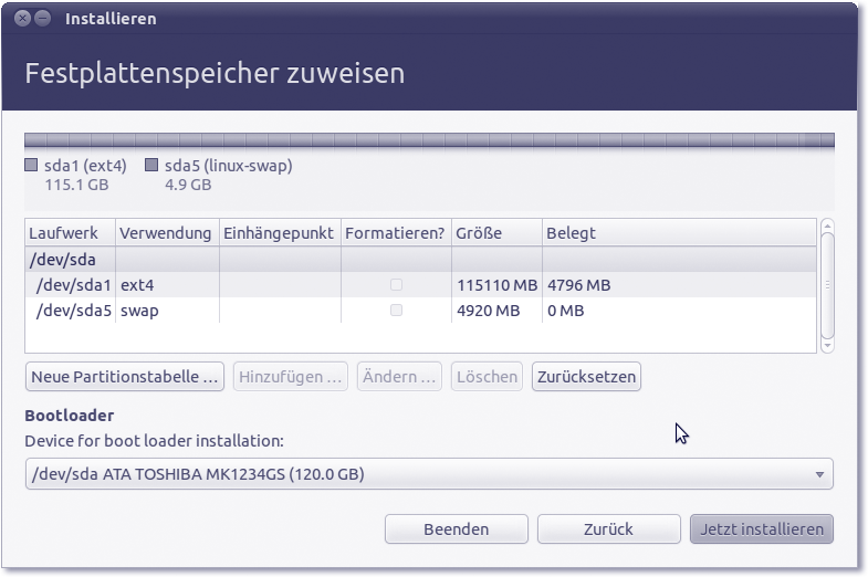 Wenn Sie bereits zuvor eine Linux- oder Ubuntu-Installation auf Ihrer Festplatte hatten, möchten Sie vielleicht in die bereits vorhandenen Partitionen ein neues Ubuntu-Linux installieren. Mir ist bewusst, dass Ubuntu dies inzwischen auch standardmäßig als Option anbietet. Bei meinen Tests hat dies aber nicht zuverlässig funktioniert. Dennoch gelingt dieser Vorgang leicht, wenn Sie manuell partitionieren und dabei Folgendes beachten: