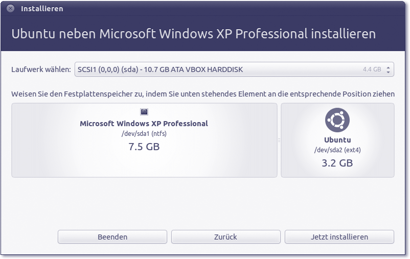 Ubuntu soll neben dem bereits vorhandenen System installiert werden. Hierbei wird das vorhandene System verkleinert, um Platz für Ubuntu zu schaffen. Wenn Sie keinen Platz für Ubuntu auf Ihrer Festplatte haben und Sie das bestehende Betriebssystem parallel behalten möchten, dann ist diese Option ebenfalls Ihre erste Wahl. Bitte beachten Sie vor der automatischen Schrumpfkur die Hinweise in Abschnitt 5.1.3, »Wenn Sie Windows neben Ubuntu behalten möchten«. Mit einem Schieberegler können Sie die Größe der Partitionen ändern. Achten Sie aber darauf, dass das existierende Betriebssystem genügend Platz behält. Es lohnt sich also, vor der Installation von Ubuntu noch einen Blick in das eventuell vorhandene System zu werfen. - Ubuntu <xy> auf die Version 12.04 aktualisieren