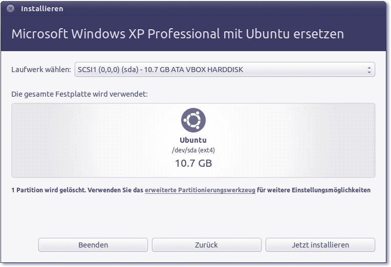 Durch diesen Punkt haben Sie die Möglichkeit, ein eventuell bereits vorhandenes Ubuntu auf die neue Version zu aktualisieren (vorhandene Daten sollten dabei erhalten bleiben). Diese Option erscheint nur, wenn sich auf Ihrem Rechner bereits ein installiertes Ubuntu befindet.Abbildung 5.14 Wenn Sie die ganze Festplatte nutzen möchten, bleibt Ihnen nur die Wahl der entsprechenden Platte übrig.