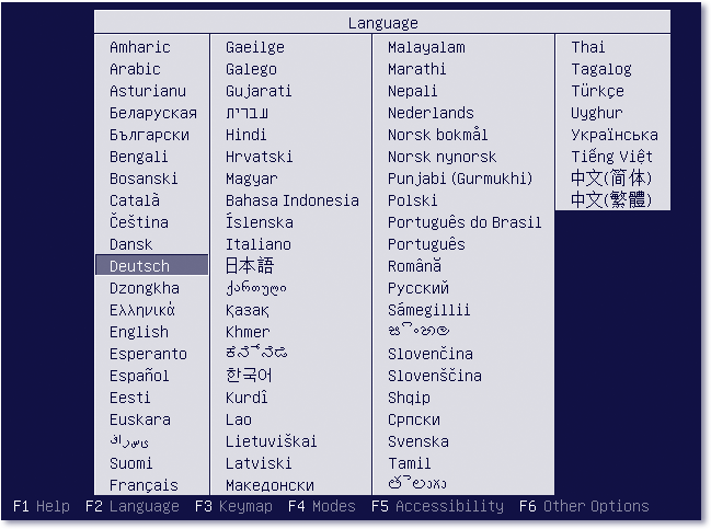 - Drücken Sie eine beliebige Taste auf der Tastatur, um weitere Einstellungen vorzunehmen. Als Erstes folgt eine Abfrage der bevorzugten Sprache (siehe Abbildung 5.6).