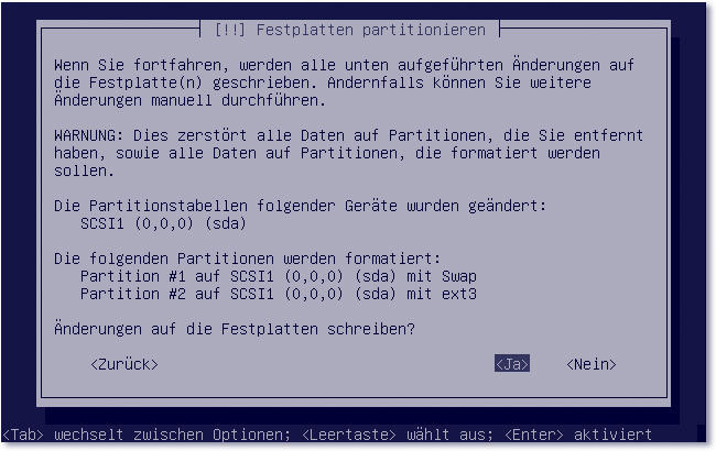 Beachten Sie, dass im Falle dieser automatischen Partitionierung sämtliche Daten Ihrer Festplatte unwiederbringlich gelöscht werden. Dies möchte man in den seltensten Fällen. Die Mehrzahl der Anwender wird die nachfolgend beschriebene Partitionierungsvariante wählen.