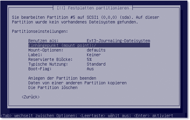 Die obigen Angaben gelten für einen durchschnittlich genutzten Arbeitsplatz-PC und stellen lediglich Mindestangaben dar. Wenn Sie einen Server betreiben, einzelne Serveranwendungen installieren oder bei Softwareinstallationen gerne und viel mit der /opt-Partition arbeiten, dann sollten Sie auf jeden Fall eine größere Root-Partition (/) wählen.