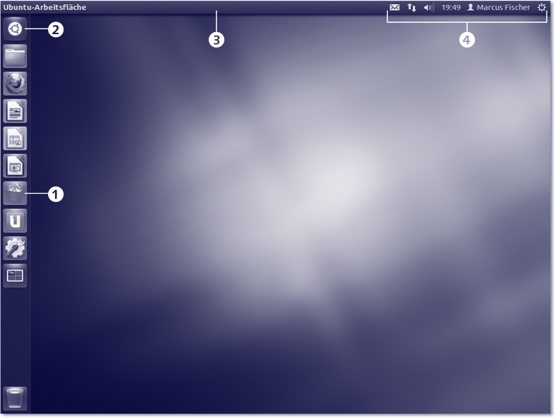 Nach der Anmeldung am System erwartet Sie die Arbeitsoberfläche von Ubuntu. Dieser sogenannte »Desktop« (zu Deutsch: Schreibtisch) ist ein Alleinstellungsmerkmal von Ubuntu und beherbergt einige neuartige Funktionen zur Bedienung eines Computers. Ich werde Ihnen in diesem Kapitel diese Funktionen vorstellen, wobei wir uns »von außen nach innen« vorarbeiten werden. Kommen wir also zunächst zur Oberfläche. Der Desktop besteht im Wesentlichen aus vier Elementen: