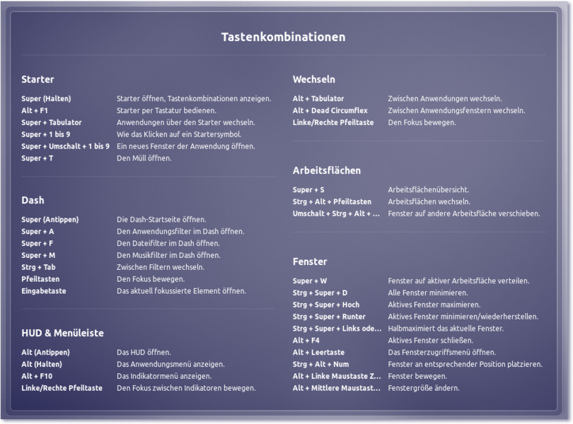 Die Super-Taste ist auf den meisten handelsüblichen Tastaturen gleichbedeutend mit der Windows-Taste, und sie birgt so manche Überraschung. So ist es durch langes Drücken möglich, die in Abbildung 6.6 dargestellte Übersicht zahlreicher »Super-Tastenkombinationen« zu erhalten. Ein kurzer Druck auf diese Taste hingegen öffnet den Launcher (siehe Abschnitt 6.3, »Der Launcher«).