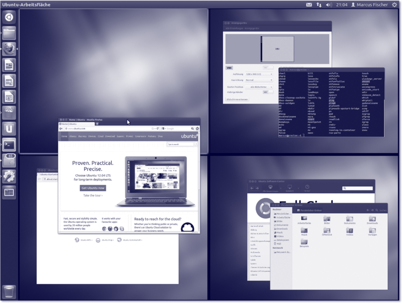 Wenn Sie Windows 7 verwenden, kennen Sie wahrscheinlich die überaus praktische Funktion Aero-Snap: Fenster werden durch eine einfache Bewegung an den Bildschirmrand geschoben und dabei automatisch auf die Hälfte des Bildschirms maximiert. So können Sie auf einfache Weise zwei Fenster nebeneinander im (jeweils halben) Vollbildmodus darstellen, um beispielsweise Dateien von einem ins andere Fenster zu bewegen. Auch Ubuntu hat endlich diese tolle Funktion spendiert bekommen. Durch das Verschieben an den oberen Bildschirmrand erreichen Sie den Vollbildmodus für ein einzelnes Fenster. Wenn Sie das Fenster wieder ein Stück vom Bildschirmrand entfernen, skaliert es sich automatisch auf die ursprüngliche Größe. Sie bewegen ein Fenster übrigens, indem Sie dieses durch die gedrückte linke Maustaste am oberen Rand »anfassen«. |