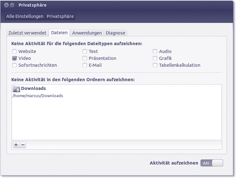 Wenn Sie möchten, dass Ubuntu gar nichts über Sie aufzeichnet, dann schalten Sie die Aufzeichnung mit dem Schieberegler Aktivität aufzeichnen ganz aus. Sie haben im ersten Reiter auch die Möglichkeit, gezielt die vorhandenen Aufzeichnungen zu löschen.