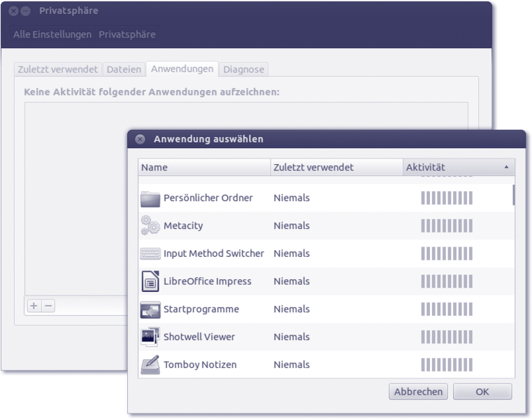 Es sind aber nicht nur die Lenses, die sich unaufhörlich merken, was Sie am Computer tun. Auch andere Anwendungen werden überwacht. Ihr Computer weiß also ziemlich detailliert, was Sie wann mit ihm angestellt haben. Und Ubuntu ist damit nicht alleine, auch die Betriebssysteme von Apple oder Microsoft beobachten Sie bei der Arbeit am Computer sehr genau. Dies mag Sie jetzt erschrecken, aber die Sammelwut Ihres Computer soll in erster Linie nicht dazu dienen, Sie auszuspionieren, sondern mögliche Fehler in den Anwendungen gezielt nachzuverfolgen.