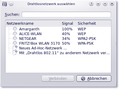 Abbildung 8.3 Aufspüren von drahtlosen Netzwerken unter KDE