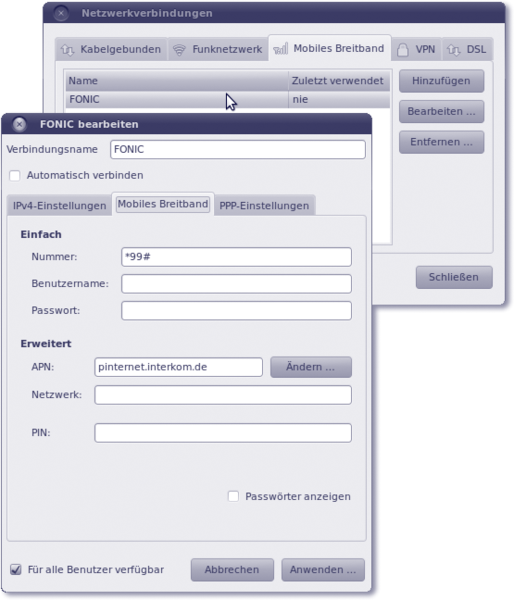 Die Verbindung richten Sie bequem über den Network-Manager ein. Klicken Sie mit der Maus auf den Network-Manager in der oberen Taskleiste, und wählen Sie Verbindungen bearbeiten. Im Reiter Mobiles Breitband können Sie durch Auswahl von Hinzufügen eine neue Verbindung anlegen (siehe Abbildung 8.4). Wählen Sie aus der Liste Ihren Service-Provider. Bei manchen Anbietern müssen Sie erst in Erfahrung bringen, welches Netz genutzt wird. So verwendet Tchibo beispielsweise das O2-Netz.