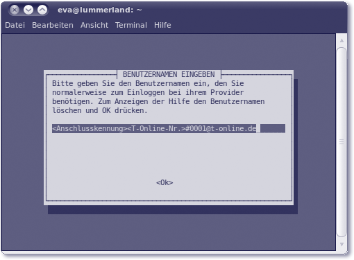 Wichtig ist schließlich die Eintragung des Provider-Login-Namens im Menü Benutzername (siehe Abbildung 8.6): Im Falle eines T-Online-Accounts hat dieser immer die Form <Anschlusskennung><T-Online-Nr.> 0001@t-online.de. Anschließend geben Sie noch Ihr Zugangspasswort ein. Die folgenden Abfragen sind ebenfalls wieder zu bestätigen, unter anderem wird die IP-Adresse eines Nameservers konfiguriert. Die Konfigurationsdaten werden schließlich in der Datei /etc/ppp/peers/dsl-provider gespeichert.